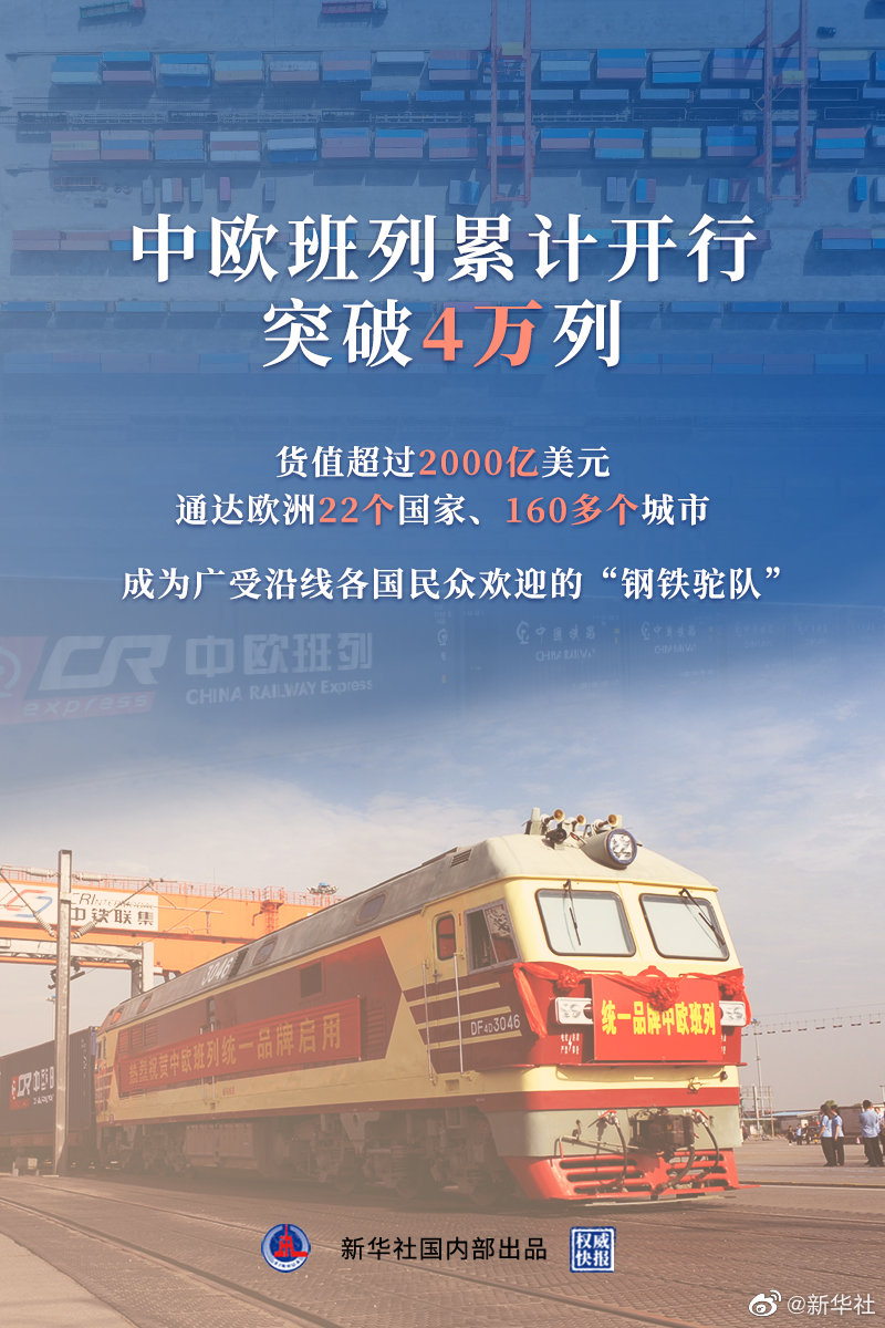 推進“一帶一路”建設工作領導小組辦公室20日召開中歐班列統(tǒng)一品牌五周年工作座談會。截至目前,中歐班列累計開行突破4萬列,合計貨值超過2000億美元,打通了73條運行線路,通達歐洲22個國家160多個城市。新冠肺炎疫情發(fā)生以來,中歐班列累計向歐洲發(fā)運1199萬件防疫物資。2011年3月,首趟中歐班列從重慶發(fā)出開往德國杜伊斯堡,開啟中歐班列創(chuàng)新發(fā)展的序章。2016年6月20日,統(tǒng)一品牌中歐班列首達歐洲(波蘭)儀式在波蘭華沙舉行。(記者安蓓,海報設計楊軼群)
