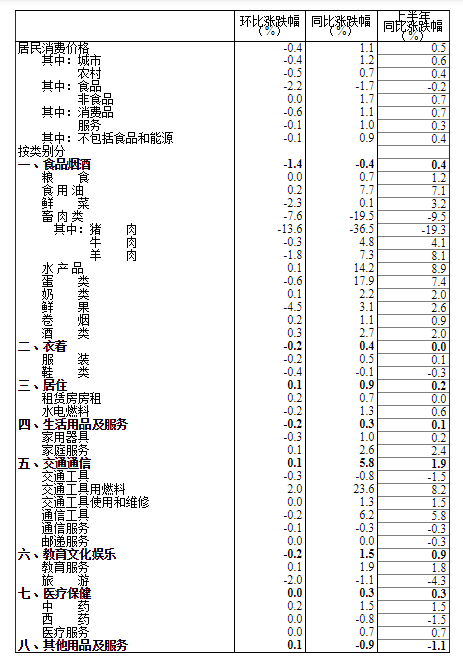 其他七大類價格環(huán)比三漲一平三降。其中,居住、交通通信、其他用品及服務價格均上漲0.1%;醫(yī)療保健價格持平;衣著、生活用品及服務、教育文化娛樂價格均下降0.2%。