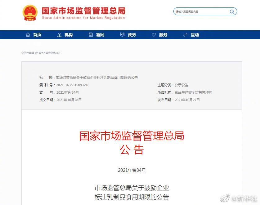 為方便消費者識別乳制品的食用期限,避免食物浪費,市場監(jiān)管總局28日發(fā)布關于鼓勵企業(yè)標注乳制品食用期限的公告,鼓勵食品生產企業(yè)生產的需冷藏保存的巴氏殺菌乳、發(fā)酵乳,在標明生產日期的基礎上,明確標注保質期到期日,如“保質期至XXXX年XX月XX日”“請于XXXX年XX月XX日前食(飲)用”等。按照食品安全法規(guī)定,食品標簽應當標注生產日期、保質期。(記者趙文君)