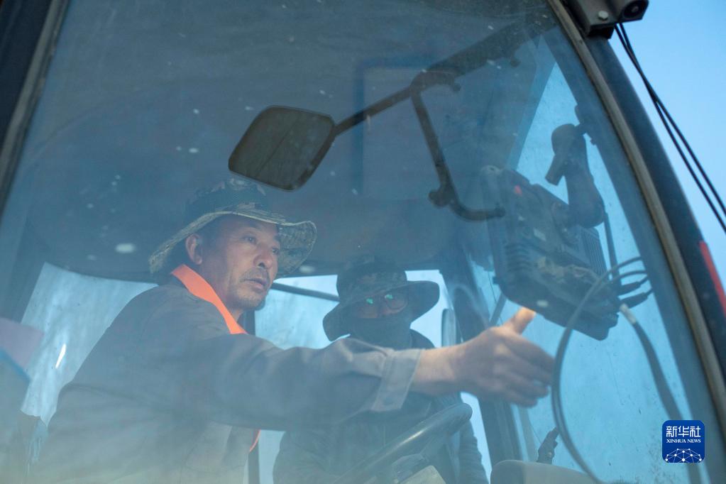 春播時(shí)節(jié),陸德文駕駛采棉機(jī)在棉田播種,兩名工人在車(chē)后跟隨保障,隨時(shí)進(jìn)行壓地膜、補(bǔ)充棉種和處理故障等作業(yè)(4月14日攝)。新華社記者 胡虎虎 攝