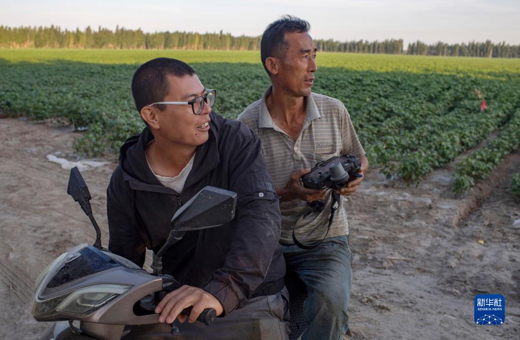 盛夏田間管理期間,陸高林的兒子陸德文(左)騎摩托車(chē)帶著農(nóng)業(yè)植保無(wú)人機(jī)操作手圍著棉地規(guī)劃飛防作業(yè)路線(7月15日攝)。新華社記者 胡虎虎 攝