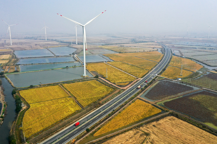 圖為11月3日拍攝的江蘇省揚州市寶應縣魯垛鎮(zhèn)5.28萬千伏安風力發(fā)電項目(無人機照片)。新華社記者 李博 攝