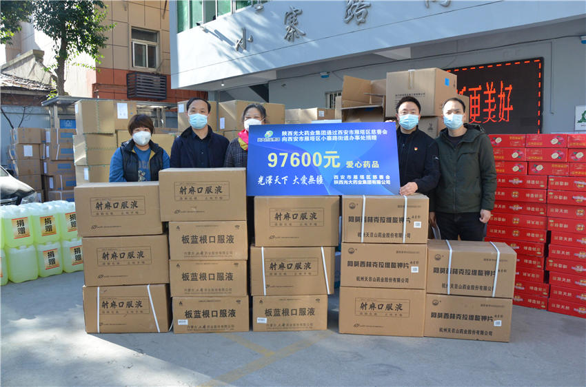 12月15日、20日,陜西光大藥業(yè)集團股份有限公司向陜西省商貿(mào)學校、西安市雁塔區(qū)小寨路街道辦事處捐贈價值10余萬元的防護口罩、消毒液等防疫物資。