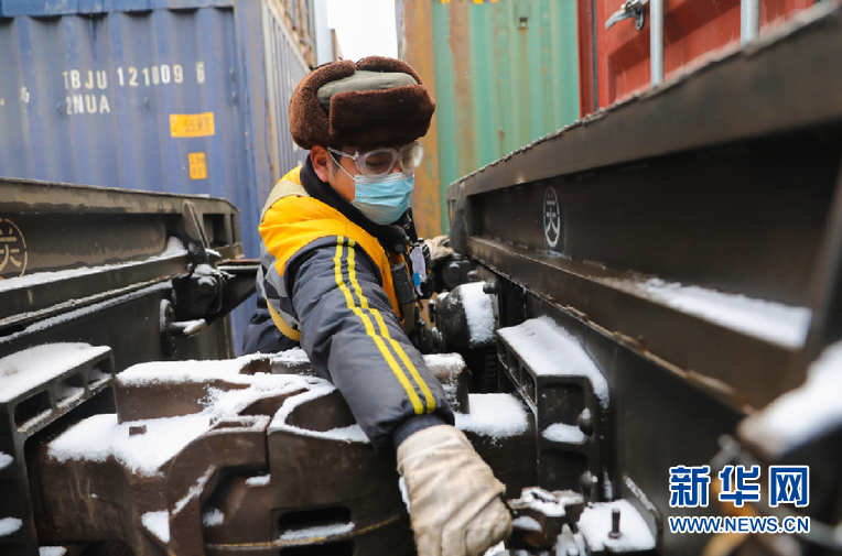 12月25日,在西安國(guó)際港站,鐵路調(diào)車作業(yè)人員正在編組中歐班列(西安)待發(fā)車輛。鐘翰林 攝