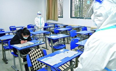 12月25日,西安外國語大學(xué)考點隔離考區(qū),監(jiān)考人員在單人隔離考場監(jiān)考。新華社記者 劉瀟攝