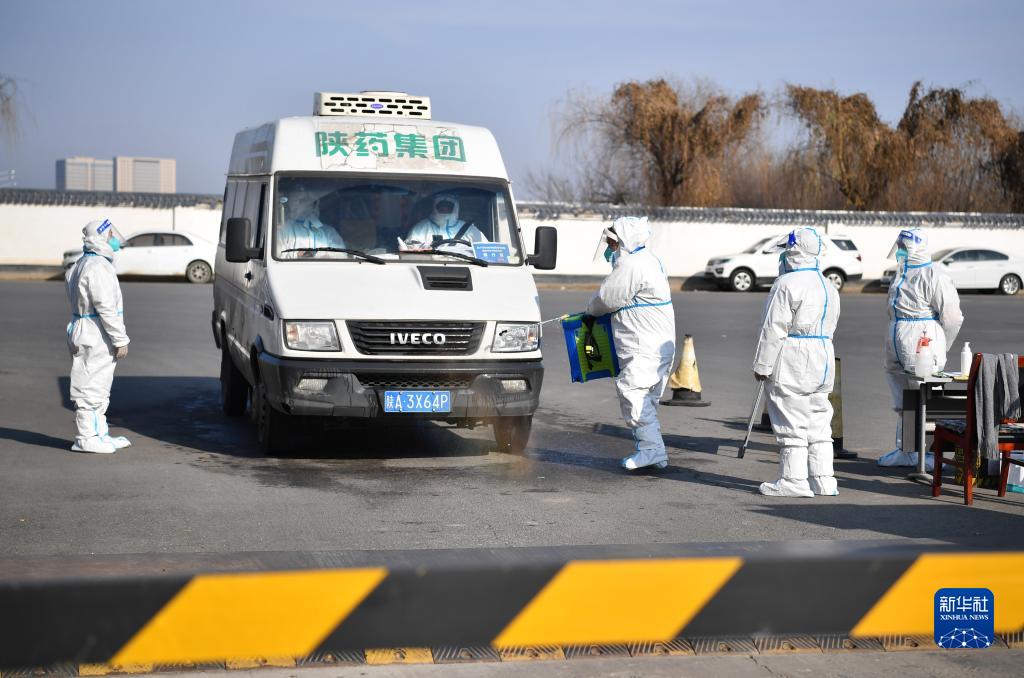 12月28日,陜藥集團派昂醫(yī)藥公司工作人員對進入園區(qū)的運輸車輛進行消殺。新華社記者 邵瑞 攝