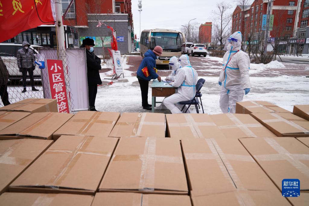 在黑龍江省黑河市愛輝區(qū)一小區(qū),社區(qū)工作人員為居民發(fā)放免費(fèi)生活物資(11月10日攝)。新華社記者 王松 攝