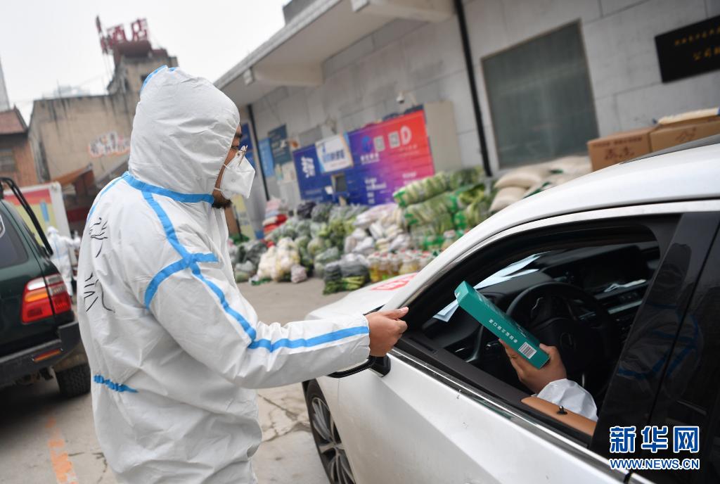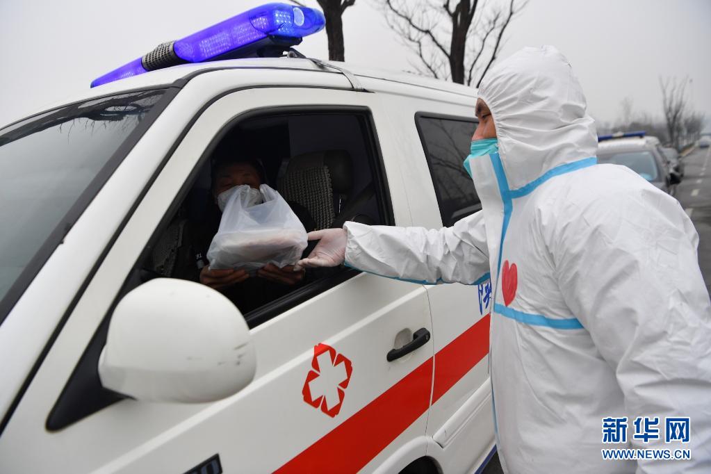 1月4日,在西安市雁塔區(qū),志愿者暢璘將食品送至一位負(fù)責(zé)運(yùn)輸核酸檢測(cè)樣本的救護(hù)車(chē)駕駛員手中。新華社記者 張博文 攝