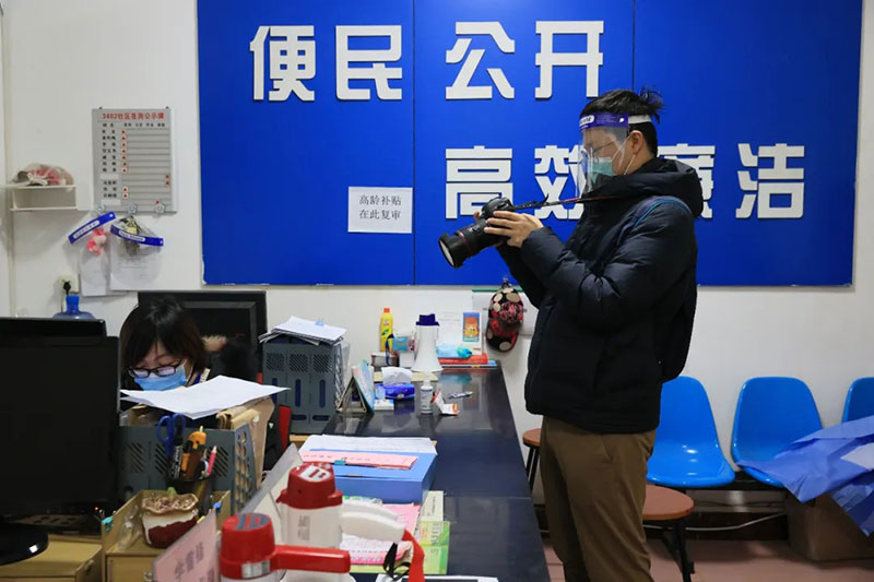 2022年1月2日,三秦都市報(bào)記者張宸豪(左)在西安市太華南路街道采訪防疫工作者。