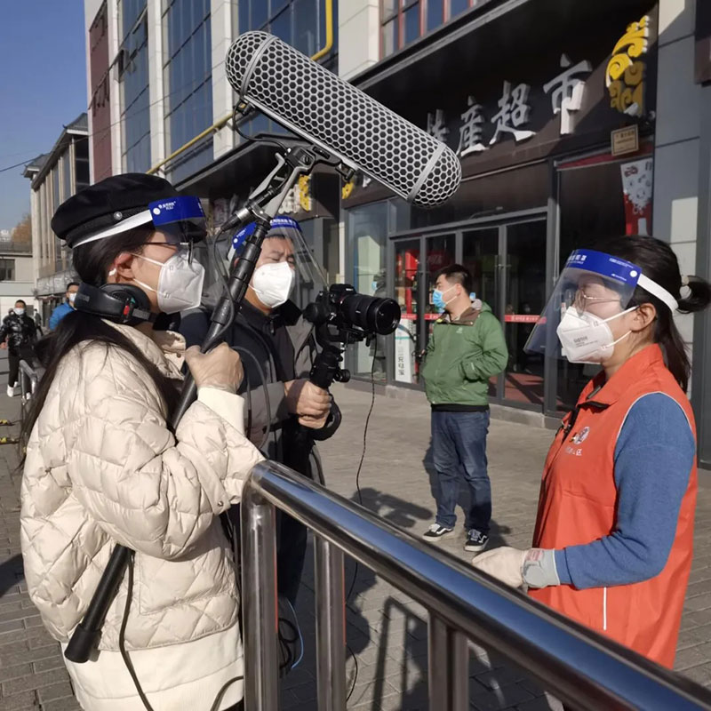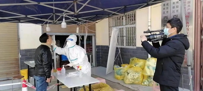 2021年12月21日,咸陽廣播電視臺(tái)記者李寒廣(右)、張潔在核酸檢測(cè)現(xiàn)場(chǎng)采訪。