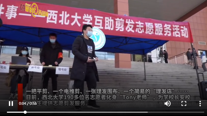 一把平剪、一個(gè)電推剪、一張理發(fā)圍布、一個(gè)簡易的“理發(fā)店”……日前,西北大學(xué)190多位名志愿者化身“Tony老師”,為學(xué)校長安校區(qū)師生提供志愿剪發(fā)服務(wù)。
