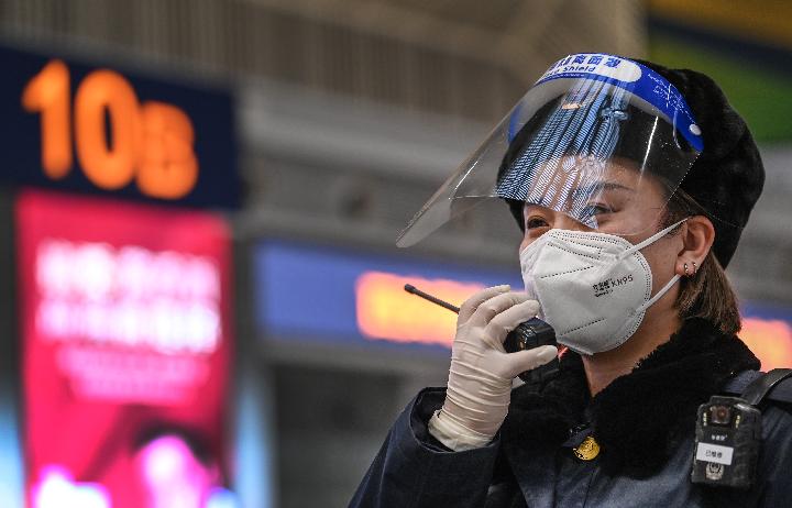 1月16日,西安北站檢票客運員向站臺聯(lián)控檢票車次信息。新華社記者 陶明 攝