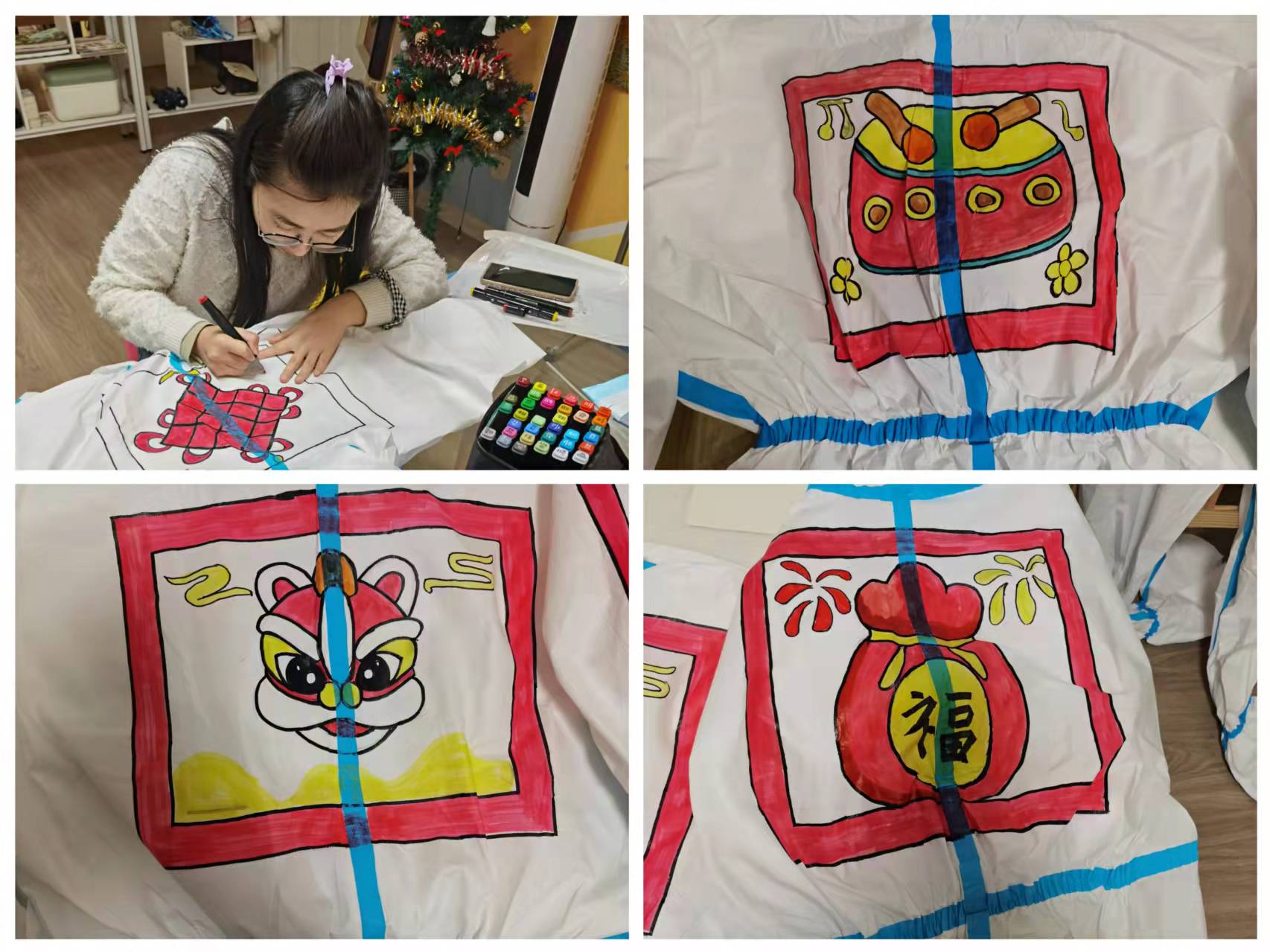 憨態(tài)可掬的小老虎,有的瞇縫著眼睛,有的張開嘴巴,有的捧著鞭炮,有的打著燈籠,還有的雙手捧“福”到家……這些五彩繽紛的圖案,出現(xiàn)在雁塔區(qū)杜城街道中鐵尚都城社區(qū)一批志愿者的防護服上,引人注目。