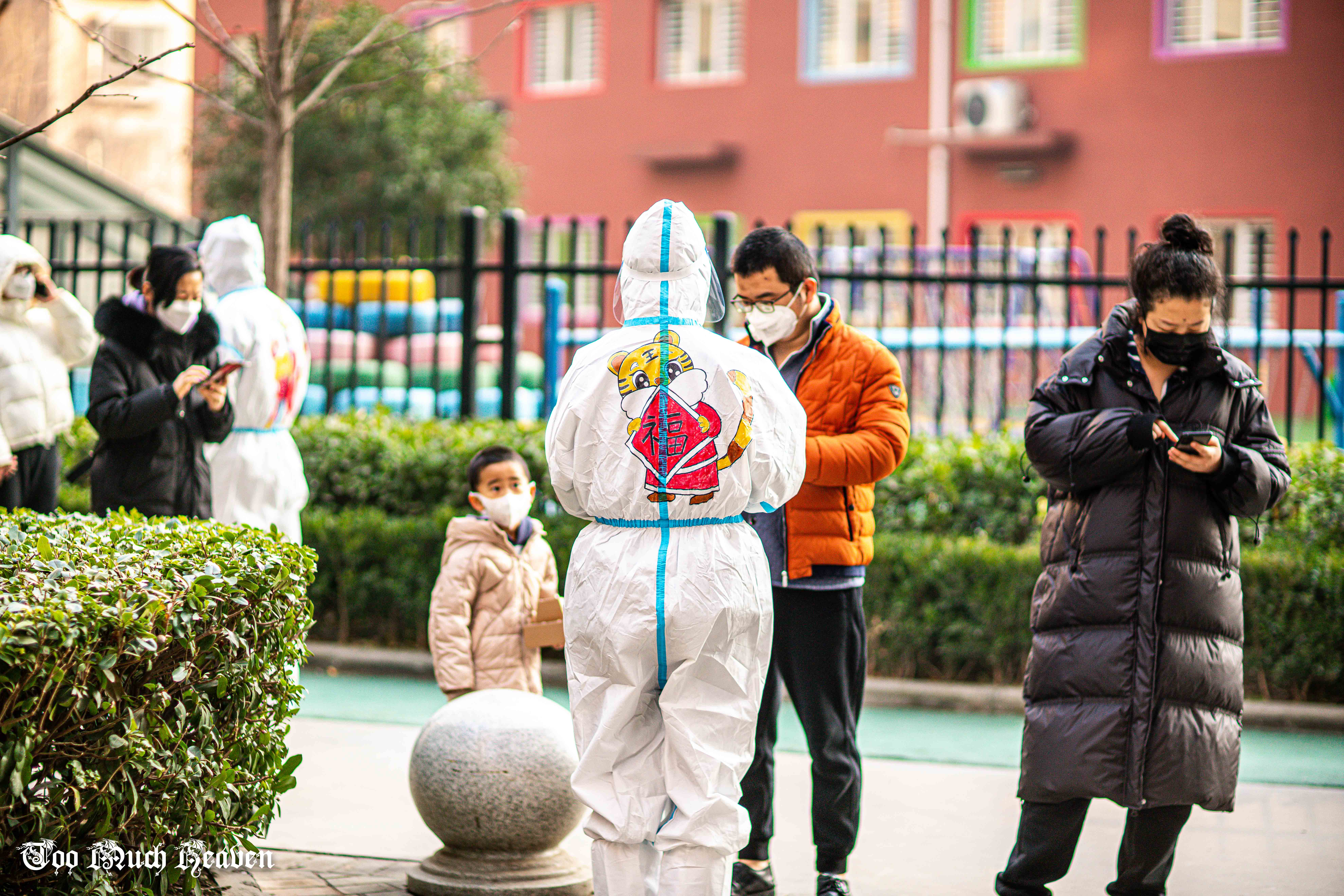 這個小區(qū)有13位志愿者組成了“抗疫志愿者先鋒隊”,全程協(xié)助醫(yī)護人員做好核酸篩查工作。隊長黨王杰每天要在防護服上為大家編號、寫名字,以示區(qū)分。有一天,他寫著寫著突然來了主意,“在防護服上畫點不一樣的圖案行不行?疫情向好,新春臨近,來個虎年主題?”
