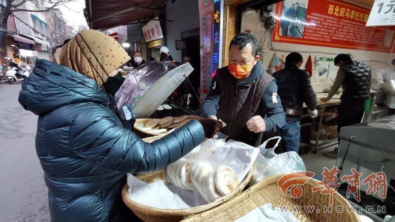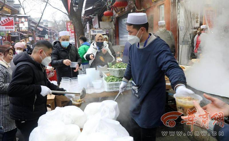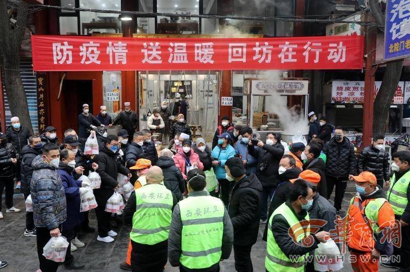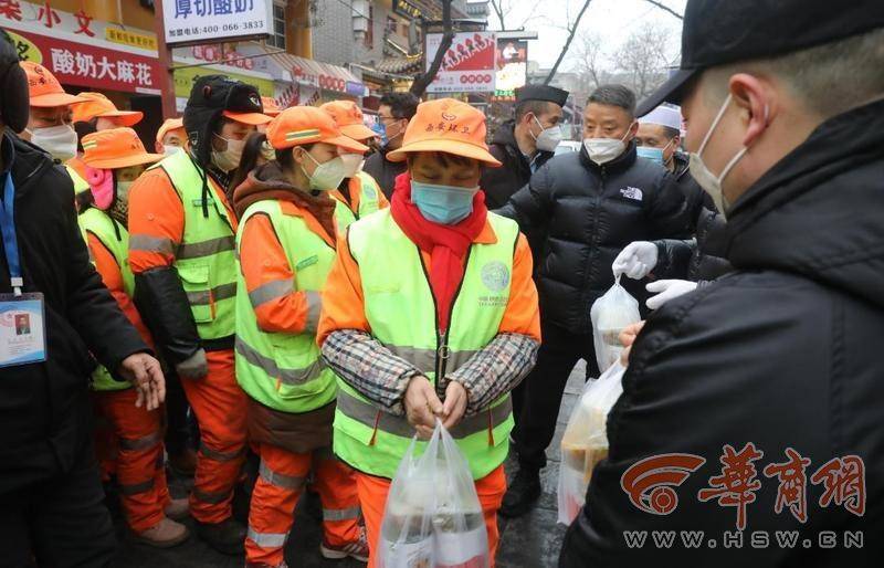 在回民街回坊老孫家泡饃店,服務員正在給周邊環(huán)衛(wèi)工免費提供午飯。“自疫情嚴控以來,我們每天為周邊參加一線防疫工作者近千份清真熟食,以感謝他們對西安市防疫做出的貢獻。”該店負責人說。