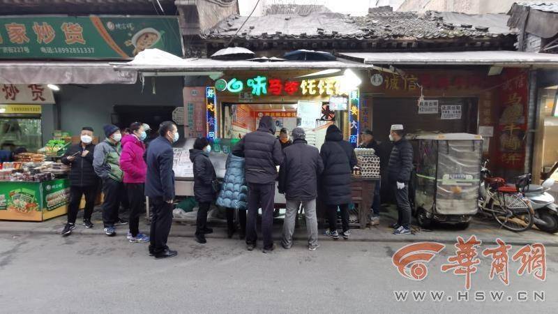 相對于回民街僅有兩三家店開門,而在周邊的大皮院、廟后街上就是另一番景象。多家餐飲店、美食攤不僅復工營業(yè)甚至門前還排起了長隊。“在家里憋了太久,就饞這一口牛肉泡饃。今天允許大家出門購物了么,就趕飯點前來這大飽口福。”在一家泡饃店門前正排隊的顧客。雖然暫時還不允許堂食,但仍不能阻擋人們對美食的向往,紛紛拎著打包好的美食帶走。