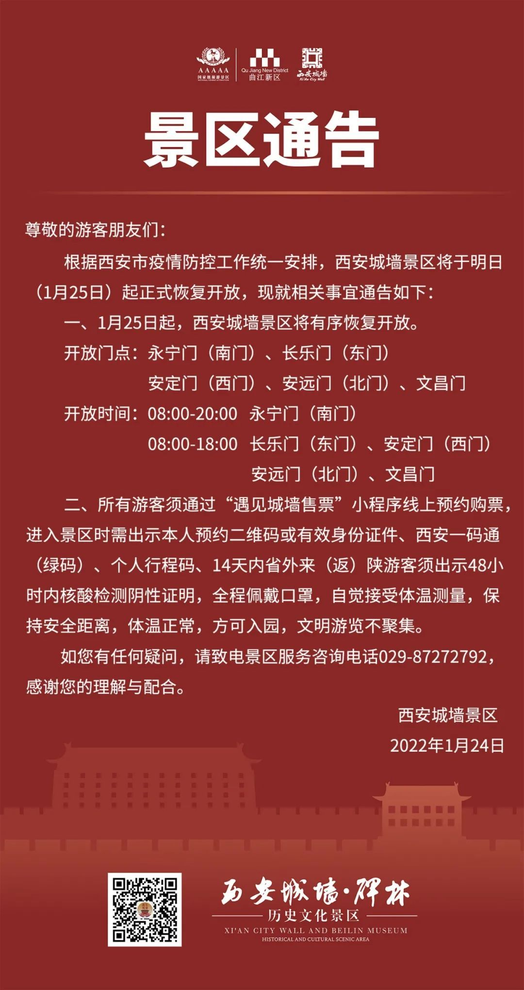 根據(jù)西安市疫情防控工作統(tǒng)一安排,西安城墻景區(qū)將于明日(1月25日)起正式恢復(fù)開(kāi)放,現(xiàn)就相關(guān)事宜通告如下: