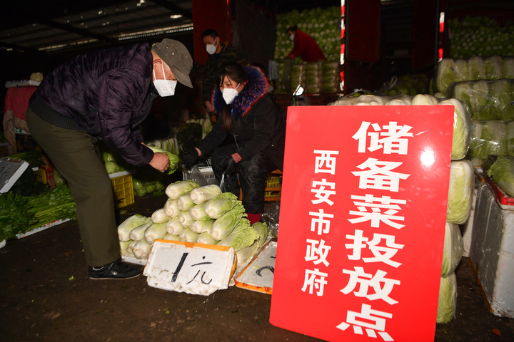1月24日,市民(左一)在西安市新城區(qū)一處儲(chǔ)備菜投放點(diǎn)購(gòu)買蔬菜。新華社記者張博文 攝