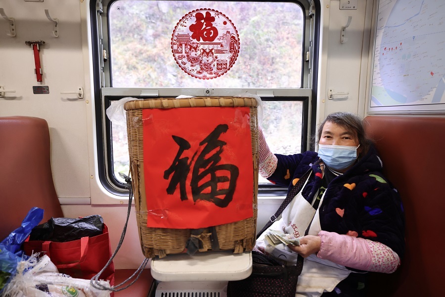 小慢車穩(wěn)穩(wěn)??吭诼躁栜囌?,一個個貼著福字的背簍滿載著沿線老鄉(xiāng)的希望與夢想奔向遠(yuǎn)方……