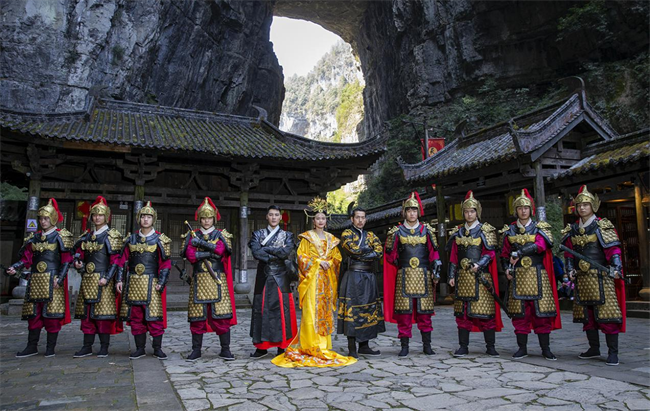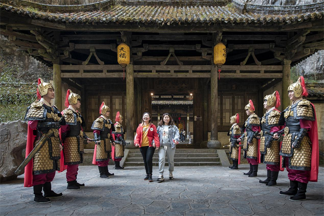 “女王駕到”“恭迎女王陛下”“諸位請起,游玩到此,觀景甚美,諸位與我,共享此景。”在天生三橋景區(qū)天福官驛客棧,一群身形魁梧的帶刀侍衛(wèi),整齊的站在驛站門口兩側恭迎每位入園的“女王”?,F(xiàn)場儀式感爆棚,一身金黃的“女王”霸氣外露。驛站內熱鬧的氛圍吸引了眾多游客參與,有的上前與侍衛(wèi)互動拍照,有的主動穿上“女王”服體驗霸氣女王范,有的還主動表演起了電影里女王翻牌的有趣橋段。“今天我最大,這樣過節(jié)著實過癮”玩得正起勁的劉女士表示,這是她過得最好玩、最具儀式感的女王節(jié)。