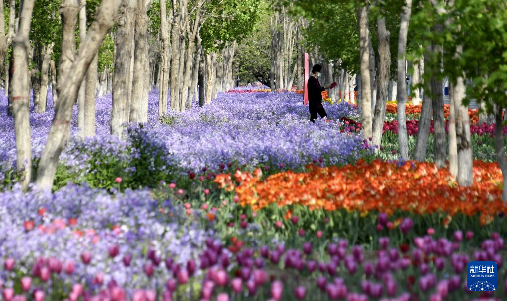 4月19日,游人在北臧村鎮(zhèn)永定河畔的綠色港灣林間賞花。