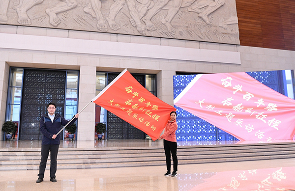 2021年1月18日,在北京國家博物館,記者代表展示“奮斗百年路 啟航新征程”大型主題采訪活動(dòng)旗幟。新華社記者 申宏/攝