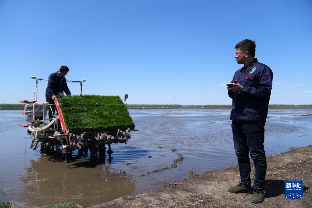 在北大荒集團(tuán)建三江分公司七星農(nóng)場有限公司萬畝稻田邊,農(nóng)機(jī)手陸向?qū)нB續(xù)輕觸兩下手機(jī),一臺帶有北斗導(dǎo)航系統(tǒng)的無人駕駛插秧機(jī)開始作業(yè)。