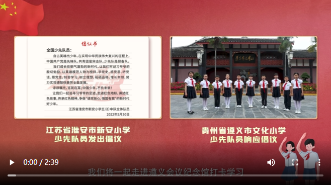 2022年5月30日,是江蘇省淮安市新安小學(xué)少先隊(duì)員們收到習(xí)近平總書記回信一周年的日子。近日,他們向全國少先隊(duì)員發(fā)出“跟著習(xí)爺爺?shù)淖阚E學(xué)黨史”的倡議。貴州省遵義市文化小學(xué)的少先隊(duì)員們第一時(shí)間響應(yīng)倡議,追尋習(xí)爺爺?shù)淖阚E,打卡遵義會議紀(jì)念館,講述紅色故事,傳承紅色基因。