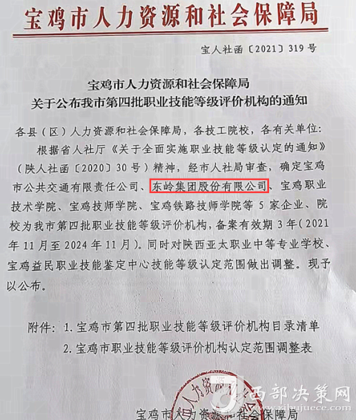 為了建立技能人才培養(yǎng)管理的長(zhǎng)效機(jī)制,東嶺集團(tuán)積極與省市人社等相關(guān)部門對(duì)接,積極創(chuàng)造內(nèi)部條件,于2021年取得了“寶雞市第四批職業(yè)技能等級(jí)評(píng)價(jià)機(jī)構(gòu)”認(rèn)證資質(zhì),公司可以自主開(kāi)展技能人才評(píng)價(jià)工作,頒發(fā)與國(guó)家職業(yè)資格證書同等效用的職業(yè)技能等級(jí)證書。取得證書后的學(xué)員,除了政府有1500元(中級(jí))、2000元(高級(jí))的現(xiàn)金補(bǔ)貼,公司也會(huì)根據(jù)實(shí)際情況提薪升職。
