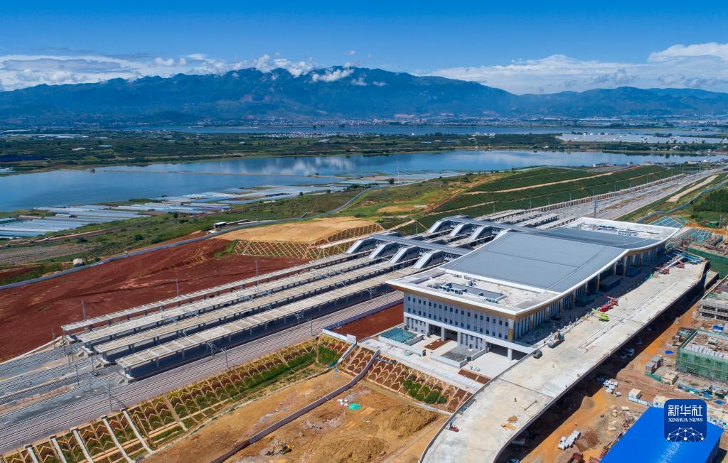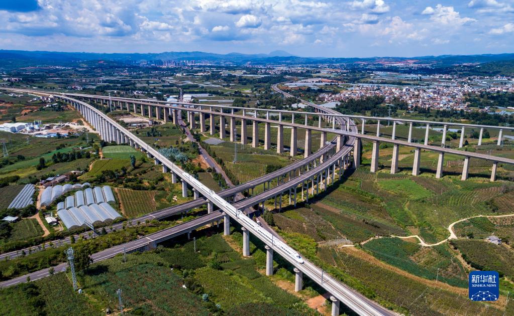 8月23日,綜合檢測(cè)車在彌蒙高鐵彌勒站附近上行線行駛,遠(yuǎn)處是下行線,中間橫向鐵路是南寧至昆明客運(yùn)專線,下穿高速是瀘彌高速(無(wú)人機(jī)照片)。新華社記者 陳欣波 攝