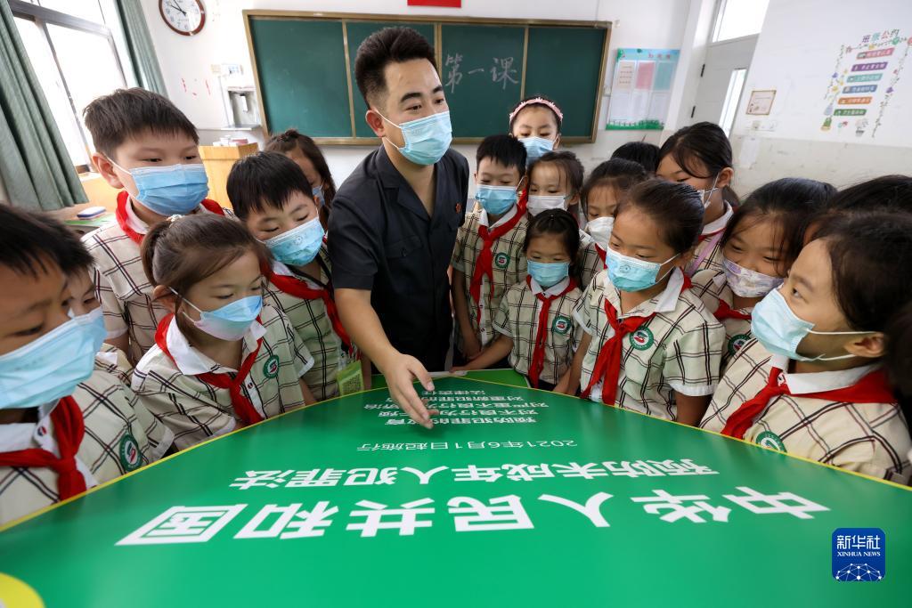 9月1日,山東省棗莊市市中區(qū)人民法院法官在建設(shè)路小學對學生進行法治宣傳教育。新華社發(fā)(孫中喆 攝)