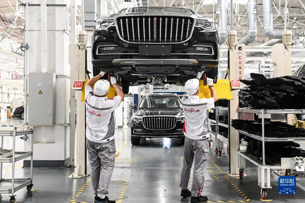 工人在位于吉林長春的一汽紅旗工廠總裝車間內(nèi)裝配車輛(2021年7月1日攝)。新華社記者 顏麟蘊(yùn) 攝