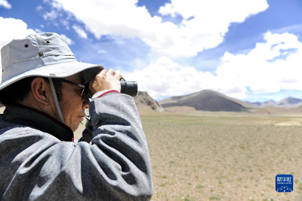 在羌塘國家級(jí)自然保護(hù)區(qū),野保員用望遠(yuǎn)鏡觀察野生動(dòng)物(2018年8月4日攝)。新華社記者 張汝鋒 攝
