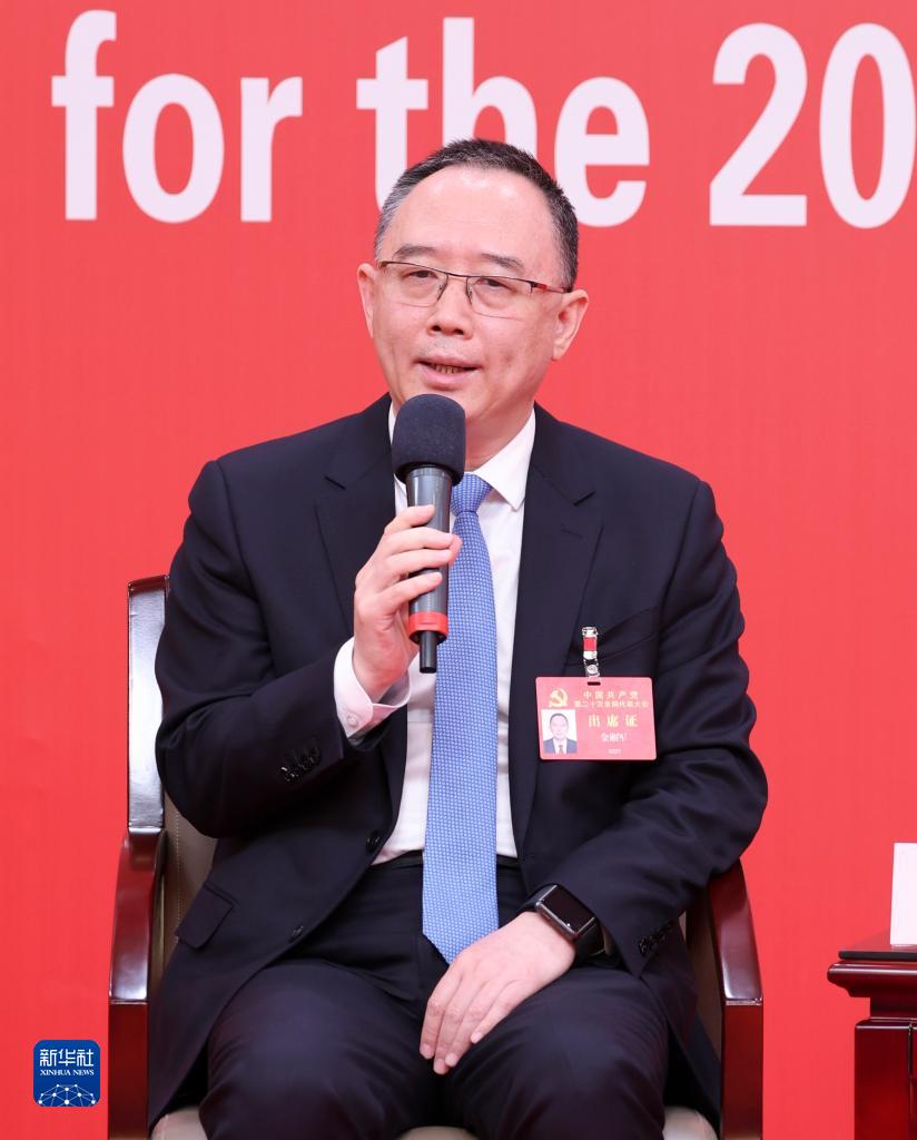 10月18日,中國共產(chǎn)黨第二十次全國代表大會新聞中心舉行集體采訪,請北京、天津、河北、山西、內(nèi)蒙古、遼寧、吉林代表團新聞發(fā)言人出席,介紹代表團學(xué)習(xí)討論二十大報告情況,并回答記者提問。這是天津市委副書記金湘軍在回答記者提問。新華社記者 張玉薇 攝