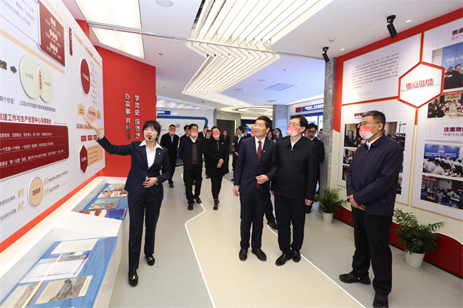 梁向峰在企業(yè)展廳向西咸新區(qū)黨工委副書(shū)記、管委會(huì)主任姜建春介紹水電十五局近年黨建情況