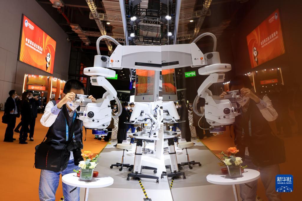11月6日,參觀者在第五屆進(jìn)博會(huì)蔡司展臺(tái)體驗(yàn)眼科導(dǎo)航手術(shù)顯微鏡。新華社記者 李京 攝