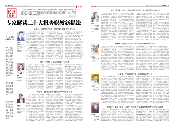 【《中國新聞》報記者 劉軍 報道】中共二十大報告對于“實施科教興國戰(zhàn)略,強(qiáng)化現(xiàn)代化建設(shè)人才支撐”進(jìn)行了詳細(xì)豐富、深刻完整的論述,其中有許多創(chuàng)新的提法,如“職普融通”和“優(yōu)化職業(yè)教育類型定位”均是首次出現(xiàn)在黨代會的文件中。本報記者就此采訪職業(yè)教育領(lǐng)域的多位專家,解讀二十大報告中關(guān)于發(fā)展職業(yè)教育、培養(yǎng)高技能的新提法。