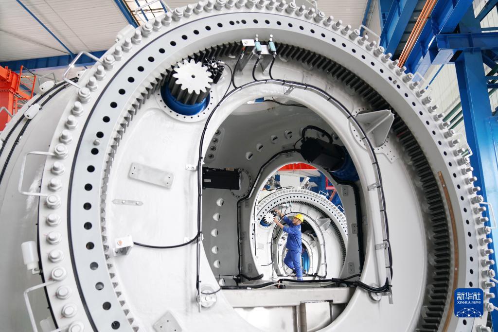 在黑龍江省齊齊哈爾市中國一重集團有限公司風電裝備生產(chǎn)制造廠生產(chǎn)車間,工人進行生產(chǎn)作業(yè)(2021年7月1日攝)。新華社記者 王建威 攝