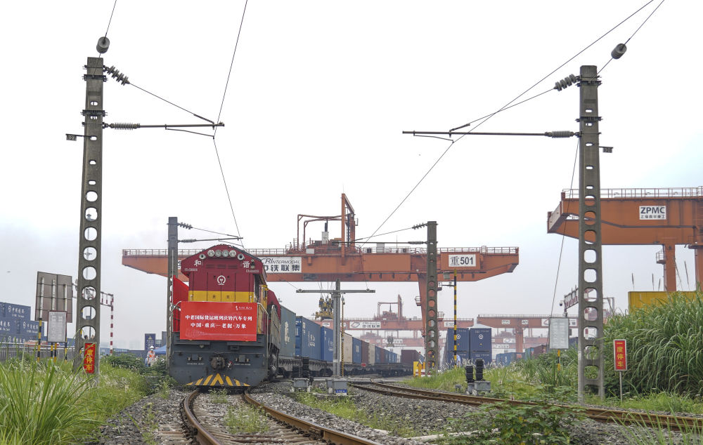 中老國(guó)際貨運(yùn)班列慶鈴汽車(chē)專列從重慶團(tuán)結(jié)村車(chē)站駛出(2022年6月8日攝)。新華社記者 黃偉 攝