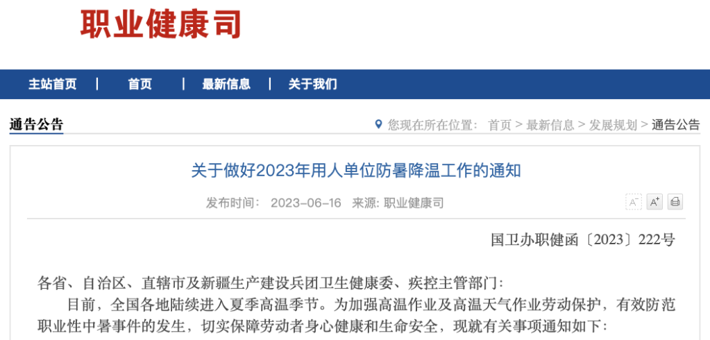 通知指出,目前,全國(guó)各地陸續(xù)進(jìn)入夏季高溫季節(jié)。近年來(lái),夏季高溫作業(yè)及高溫天氣作業(yè)導(dǎo)致勞動(dòng)者中暑死亡的事件時(shí)有發(fā)生,對(duì)勞動(dòng)者身心健康和生命安全造成嚴(yán)重威脅。各級(jí)衛(wèi)生健康行政部門和疾控主管部門要進(jìn)一步明確工作責(zé)任,加強(qiáng)組織領(lǐng)導(dǎo),系統(tǒng)謀劃部署,協(xié)同推進(jìn)用人單位防暑降溫工作和各項(xiàng)職業(yè)病預(yù)防工作。