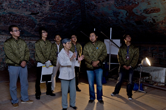 樊錦詩在莫高窟第85窟壁畫修復(fù)現(xiàn)場(chǎng)檢查工作。