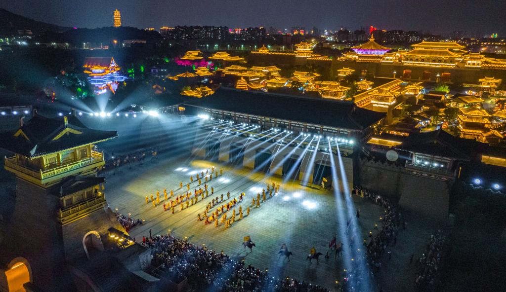 夜幕降臨,湖北襄陽盛世唐城景區(qū)燈光閃爍、樂聲怡人,游客沉浸式體驗(yàn)夜游項(xiàng)目《盛世唐城之大唐倚夢2》。沿著參觀路線,游客可觀賞不同的劇目表演,體驗(yàn)盛唐情景。近年來,國家歷史文化名城襄陽注重發(fā)掘人文元素,激發(fā)文旅產(chǎn)業(yè)活力,推動當(dāng)?shù)貜穆糜芜^境地向旅游目的地轉(zhuǎn)變。