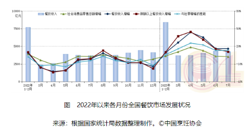 中國烹飪協(xié)會分析,7月份,全國餐飲收入、限上餐飲收入增速分別較上年同期上漲17.3%、12.1%。1-7月份,全國餐飲收入、限上餐飲收入增速分別比上年同期上升27.3個、28.2個百分點。