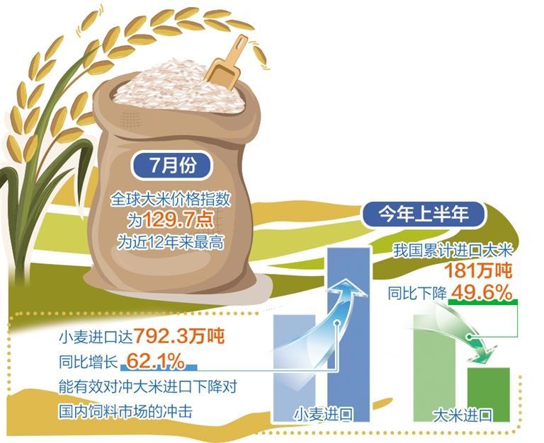 “為了確保大米進(jìn)口穩(wěn)定性,我國各類進(jìn)口主體也在推進(jìn)大米進(jìn)口多元化,避免來源地和品種過于集中帶來的進(jìn)口安全風(fēng)險(xiǎn)。”彭超說。一方面,推進(jìn)大米進(jìn)口來源地多元化。我國大米進(jìn)口來源地包括越南、緬甸、泰國、印度、巴基斯坦、柬埔寨等主產(chǎn)國。從去年10月起,我國開始逐步減少印度碎米進(jìn)口,印度已從過去幾年中國最大的大米供應(yīng)商滑落至第四位。另一方面,推進(jìn)糧食進(jìn)口品種多元化。減少大米進(jìn)口的同時(shí),增加飼用小麥進(jìn)口。今年上半年,我國小麥進(jìn)口量達(dá)到792.3萬噸,較去年同期增長62.1%,能夠有效對(duì)沖大米進(jìn)口下降對(duì)國內(nèi)飼料市場的沖擊。