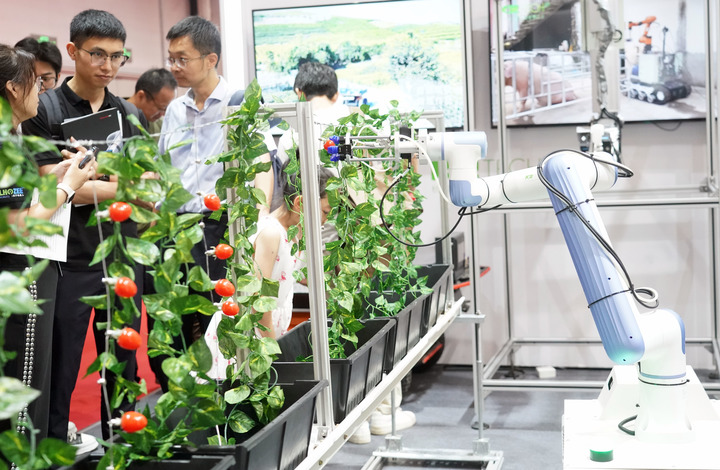 在農(nóng)業(yè)展區(qū),碩大的果園多臂采摘機器人引人注目。機械手臂通過位置和光感靈敏伸出準確抓住一個蘋果,讓觀眾對農(nóng)業(yè)現(xiàn)代化和智能化有了更直觀的了解。這款機器人由北京市農(nóng)林科學院智能裝備技術研究中心研制,通過機械臂和果實獲取裝置,實現(xiàn)采果、納果、儲果全程自動化采收,并具備晝夜連續(xù)作業(yè)的能力,每小時可以采摘400至550果,大幅提升了采摘效率。