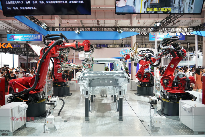 強勁靈活的手腕,高扭矩的設計,4個紅色的機械臂上下?lián)]舞,為汽車車身進行點焊作業(yè)……在2023世界機器人大會上,沈陽新松公司針對汽車工業(yè)研發(fā)的白車身點焊機器人工作站引人注目。