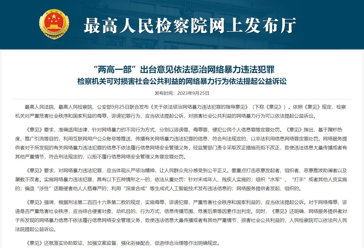 最高人民法院、最高人民檢察院、公安部9月25日聯(lián)合發(fā)布《關(guān)于依法懲治網(wǎng)絡(luò)暴力違法犯罪的指導意見》(下稱《意見》)。依照《意見》規(guī)定,檢察機關(guān)對嚴重危害社會秩序和國家利益的侮辱、誹謗犯罪行為,應當依法提起公訴,對損害社會公共利益的網(wǎng)絡(luò)暴力行為可以依法提起公益訴訟。