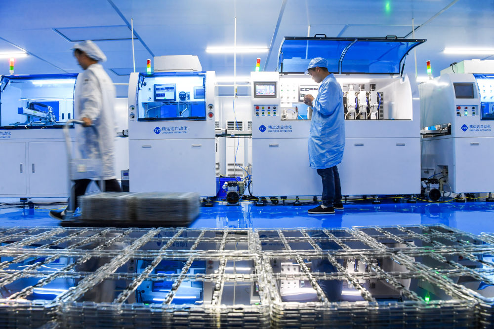 12月12日,宜春市上高縣江西挺好光電科技有限公司的工人在生產(chǎn)線上趕制液晶顯示屏。(周亮 攝)