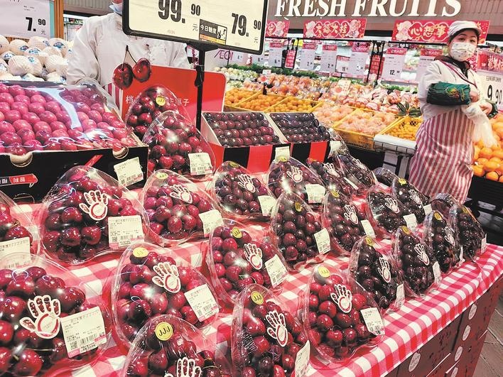1月4日上午,當記者來到漢口興業(yè)路的一座大型連鎖超市時,水果區(qū)里的工作人員正在將分裝完畢的車厘子進行碼堆,同時更換了新的價簽。