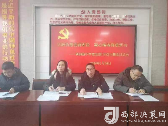 西部決策網(wǎng)訊(記者帥華鋒 張隴峰)為深入開展學(xué)習(xí)貫徹習(xí)近平新時代中國特色社會主義思想主題教育,貫徹落實黨的二十大精神,增強(qiáng)基層黨組織凝聚力和戰(zhàn)斗力,錘煉黨員黨性,凝心聚力,擔(dān)當(dāng)作為,立足崗位作貢獻(xiàn),1月24日,寶雞市金臺區(qū)新福園中學(xué)黨支部舉行主題為“學(xué)深悟透創(chuàng)新理論,凝心鑄魂再建新功”的主題黨日活動。本次活動由黨支部書記王鐵昌主持。校長安開琴應(yīng)邀列席。